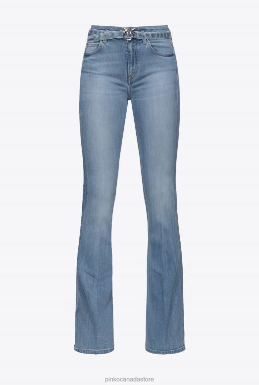 Flare-fit, stretch blue denim jeans with five pockets and light wash. Regular waist with belt loops, matching-fabric belt with mini Love Birds Diamond Cut buckle, and slim-fitting legs that flare out at the bottom. Metal zip and tack-button fastening.