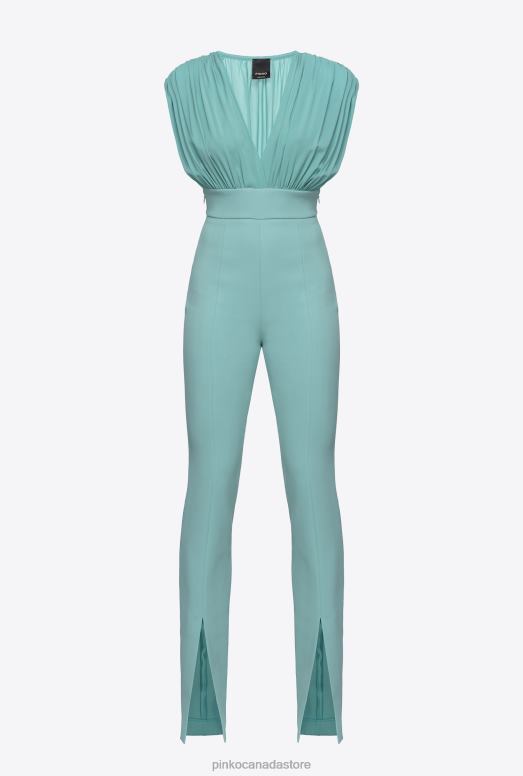 Sleeveless jumpsuit with draped-effect stretch georgette bodice and V-neck at the front. Slim-fitting, high-waisted trousers in technical stretch crepe fabric with slit in the middle at the bottom of the legs. Invisible zip fastening on both sides. – Model is 177cm tall and wears a size 40.