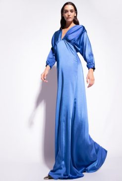 Long, elegant satin dress with slightly loose-fitting upper part, plunging neckline at the front, three quarter-length sleeves and keyhole with long ties that tie into a bow in the middle at the back. Empire waistline and long, flowing and feminine skirt. This garment is part of the “Dress to Impress” partywear capsule collection.