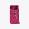 Smartphone holder with glitter all over, grainy texture and custom Love Birds Diamond Cut plaque on a leather base. Card slots on the back. Fabric lining. Thin round metal-chain shoulder strap.