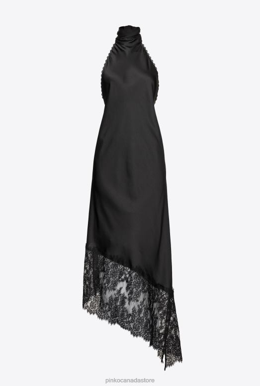 Sleeveless satin midi dress. Halterneck with scalloped edge at the side, high neck fastened at the back and open back. Flowing midi skirt with wide floral lace trim at the asymmetric hem. This piece is made from sustainable material containing recycled fibres, with the aim of reducing resources used and increasing product quality. This piece is made from material that is processed without substances that may harm the environment or consumer health.