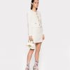 Straight-cut mini skirt in patterned tweed fabric. Rear button fastening, cut-out detail and invisible zip in the middle at the back.