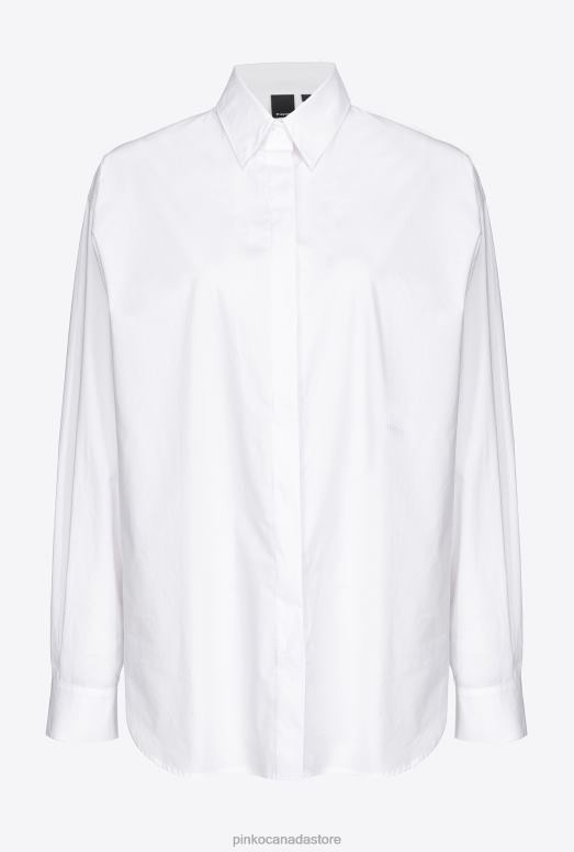 Slightly oversized classic-cut shirt in 100% cotton poplin. Classic collar and long sleeves with cuffs. Mini PINKO logo embroidered on the front. Covered button fastening down the front. Only the first one is visible. – Model is 177cm tall and wears a size 40.