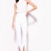 Sleeveless lingerie-style top in lined Valenciennes lace fabric. Thin adjustable shoulder straps, V-neck at the front, straight neckline at the back and side slit at the front.