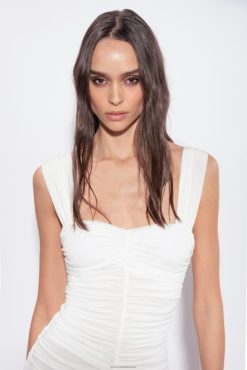 Sleeveless one-shoulder top in stretch cotton poplin. Twisted detail and a subtle slanted cut-out on the shoulder and gentle draping on the waist. – Model is 177cm tall and wears a size 40.