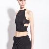 Sleeveless top with sequin embroidery all over and vertical striped pattern. Constructed with panels that create a three-dimensional draped effect, thin shoulder straps and V-neck on the front and back. – Model is 175cm tall and wears a size 40.