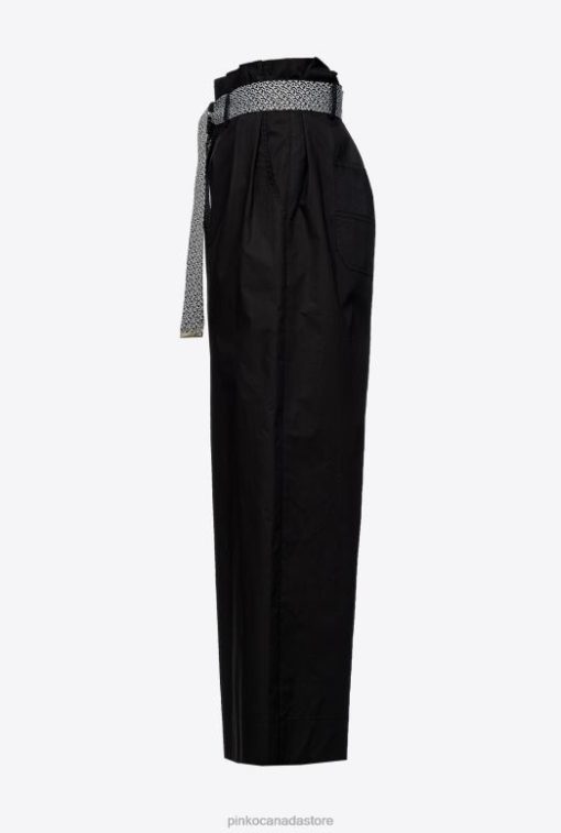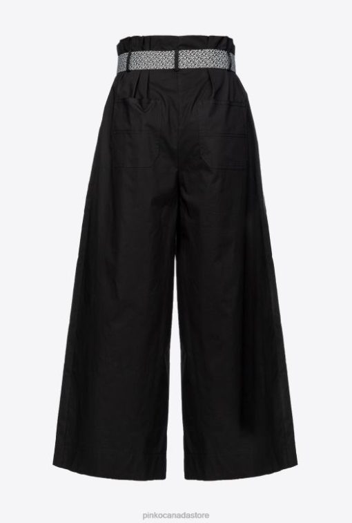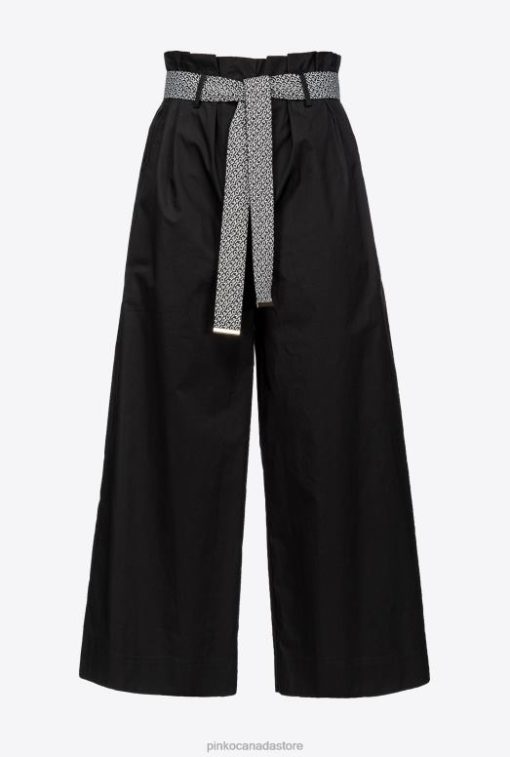 Slightly cropped, wide-leg cotton poplin trousers. High waist with darts and matching tie belt with PINKO logo all over and metal tips. Slanted side pockets and patch pockets at the back. Zip and hook fastening.