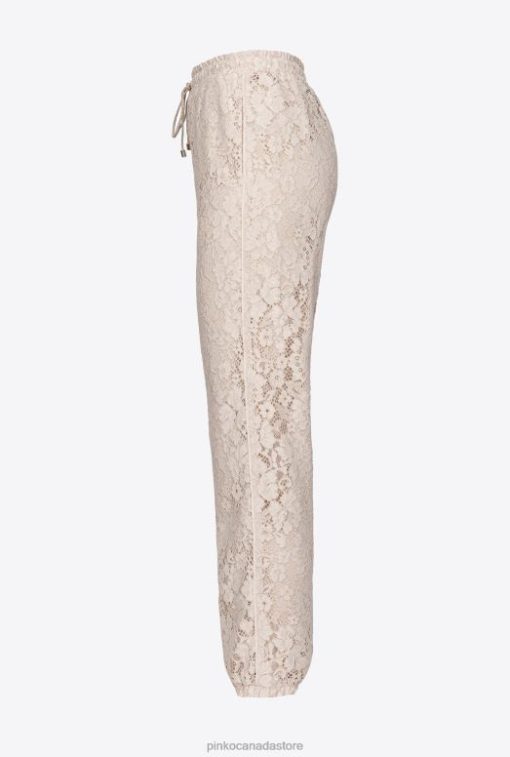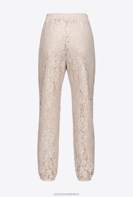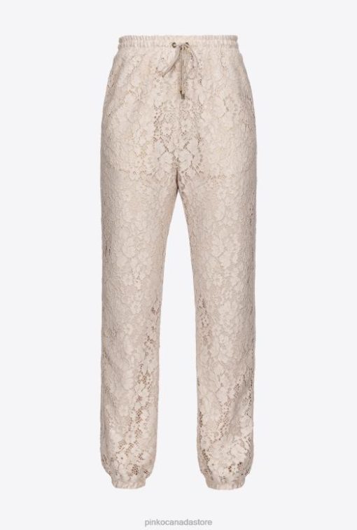 Floral lace joggers with special laminated finish. High elastic waist with drawstring, inset side pockets and elasticated leg hems. – Model is 177cm tall and wears a size 40.
