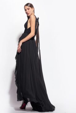 Extra-long, sleeveless dress in light viscose georgette. Plunging V-neck fastened with long ribbon ties at the back which drape freely when knotted. Empire waistline and asymmetrical skirt with short front and extra-long back and sides with train and frilly edging. Concealed central zip fastening on the back. – Model is 177cm tall and wears a size 40.