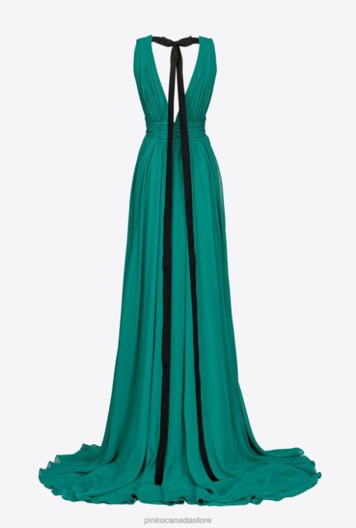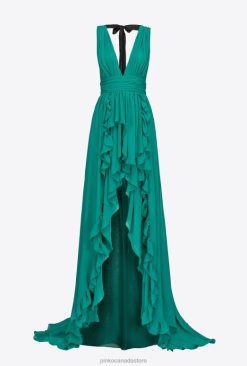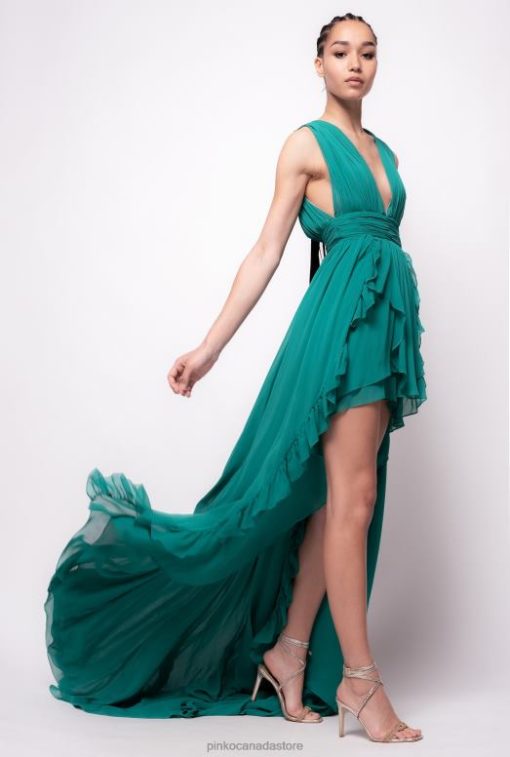 Extra-long, sleeveless dress in light viscose georgette. Plunging V-neck fastened with long ribbon ties at the back which drape freely when knotted. Empire waistline and asymmetrical skirt with short front and extra-long back and sides with train and frilly edging. Concealed central zip fastening on the back. This garment is part of the “Dress to Impress” partywear capsule collection.