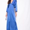Long, elegant satin dress with slightly loose-fitting upper part, plunging neckline at the front, three quarter-length sleeves and keyhole with long ties that tie into a bow in the middle at the back. Empire waistline and long, flowing and feminine skirt. This garment is part of the “Dress to Impress” partywear capsule collection.