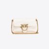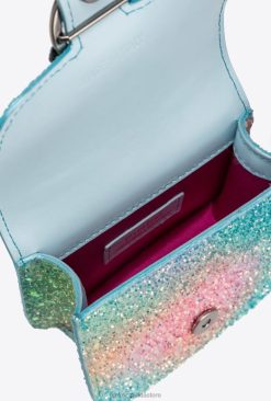 Rounded-edge Micro Love Bag Bell in rainbow glitter fabric. This textile material is spray-dyed and then coated with a special glue to adhere the glitter colour, in turn, creating a “glazed” effect. As the treatment is very delicate, please try to avoid rubbing the surface, so as not to dislodge the glitter. The fastening is embellished with the iconic metal Love Birds Diamond Cut buckle. The accessory also comes with a top handle and a removable thin chain shoulder strap, complete with adjustable shoulder padding. The buckle and chain boast distinctive nuanced detail, obtained by means of a special dye bath: the individual components are immersed, one by one, in the dye solution for a few seconds, and for this reason, may have a different end result, which in turn, makes each product unique. The bag is part of the Limited Edition special capsule collection which comprises PINKO Galleria-exclusive limited-edition models. Use the special NFC chip to enjoy a special experience, specific to the bag you have just bagged!