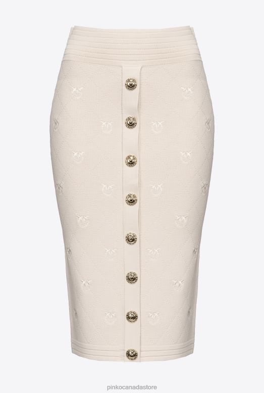 Midi skirt in pique-knit jacquard fabric, with Love Birds logo embroidered all over. Snug-fitting with elastic waistband and row of golden buttons down the front. Metal zip fastening in the middle at the back and pull customised with Love Birds logo. – Model is 177cm tall and wears a size 40.