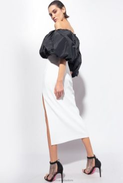Slim-fitting calf-length dress in stretch crepe fabric featuring a voluminous taffeta upper section. This couture allure-reminiscent fabric has been designed to create elegant, striking and sculptural silhouettes: the crisp-touch taffeta boasts the same appearance on both the front and underside, and is particularly suitable for emphasising volumes. The taffeta top features an off-the-shoulder neckline and balloon sleeves, while the slim-fitting skirt has a slit at the side on the front. Keyhole fastened with small button at the back of the neck and invisible zip in the middle. – Model is 177cm tall and wears a size 40.