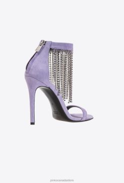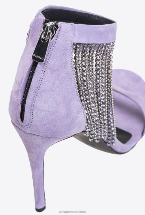 Soft suede sandals with ankle strap embellished with rhinestone fringing. Round toe and leather sole with 10-cm stiletto heel. Padded leather insole and breathable microfibre lining. Zip fastening at the heel.