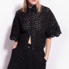 Crop top in 100% cotton fabric with delicate broderie anglaise all over. V-neck with drawstring that allows the wearer to personalise the fit, puffed short sleeves with elasticated ends, and slightly scalloped hem. Fastened with metal zip in the middle at the back.