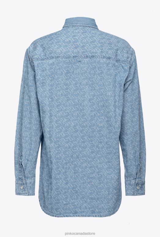 Slightly oversized light denim shirt, with laser-cut pattern with the letter ‘P’ and the Love Birds logo all over. Classic collar, long low set-in sleeves, and hem that is slightly longer at the back. Press-stud fastening.