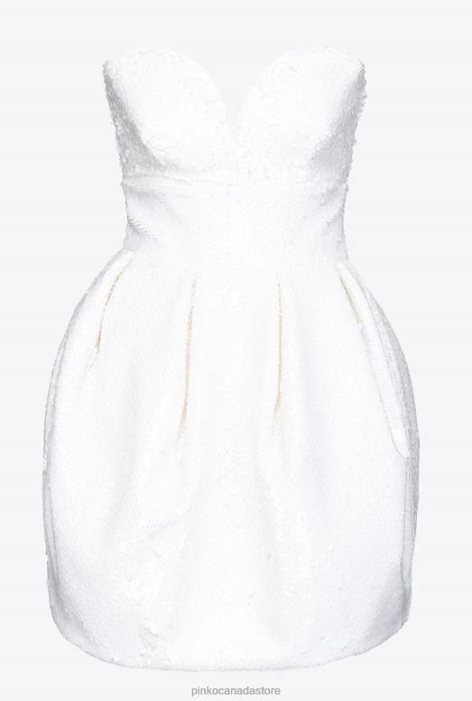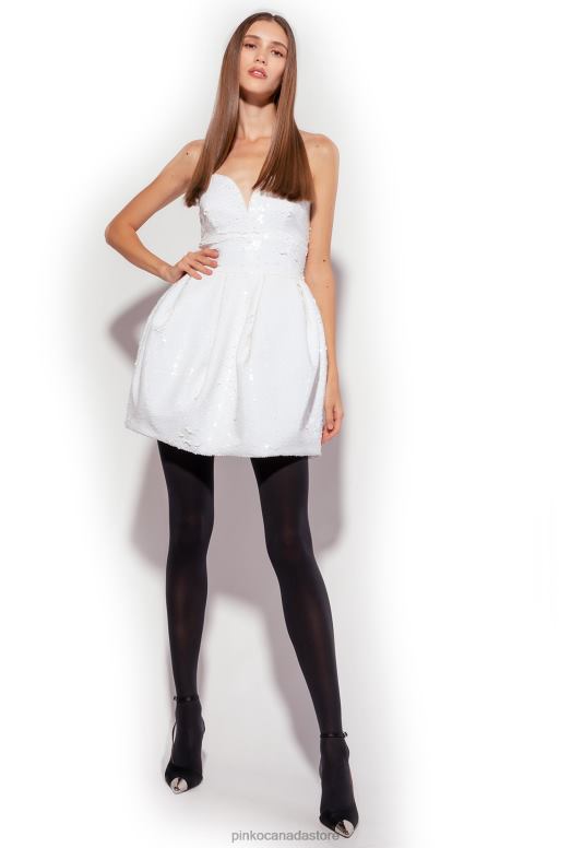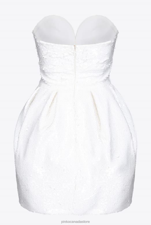 Short sleeveless dress in iridescent white full sequin-embroidered fabric with a special shiny effect. The strapless sweetheart-neck bodice is fitted and reinforced with a contoured underwire which separates the design, whilst giving rise to the inverted pleats and pleats which form the waist-inset balloon skirt. Lined model. Concealed central zip fastening on the back. The garment is part of the Limited Edition special capsule collection which comprises PINKO Galleria-exclusive limited-edition models.