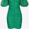 Short, slim-fitting dress in light stretch satin fabric, with striking semi-glossy effect. V-neck, structured shoulders with long sleeves, and gathering and draping on the skirt. Concealed central zip fastening on the back. – Model is 177cm tall and wears a size 40.