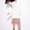 Short sleeveless tulle sheath dress with tattoo-style bead embroidery on the front and back. Straight-cut piece with round neck and beaded fringe at the bottom. Lined. Small button-adorned central keyhole fastening at the back. – Model is 177cm tall and wears a size 40.