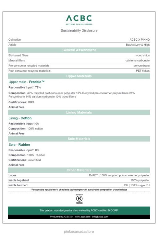 High-top basketball-style sneakers created in collaboration with ACBC, a company that strives to combat climate change and reduce its environmental impact through better decisions and materials. The materials used to make these sneakers are responsibly sourced: “bio-based” or recycled. Multi-coloured inserts and piping, embellished by the embossed Love Birds logo on both sides and the PINKO lettering printed on the heel. 3-cm box sole.