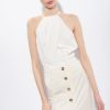Sleeveless crop top in flowing crepe fabric. Round neck with darts and button on the back, wrap front and a long cut-out on the centre back. Central metal zip fastening on the back of the hem. – Model is 175cm tall and wears a size 40.