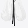 Taffeta shrug with ribbon-fastened collar and very large and voluminous balloon sleeves.